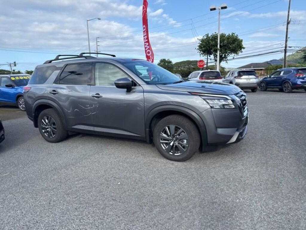 Certified. Gun Metallic 2025 Nissan Pathfinder SV FWD 9-Speed Automatic 3.5L V6 DOHC Fresh oil change, *Permaplate paint protected*, CERTIFIED, Pathfinder SV, 4D Sport Utility, 3.5L V6 DOHC, 9-Speed Automatic, FWD, Gun Metallic, Charcoal w/Cloth Seating Surfaces, 3rd row seats: bench, 4-Wheel Disc Brakes, 6 Speakers, Air Conditioning, AM/FM radio: SiriusXM, NissanConnect featuring Apple CarPlay and Android Auto, Panic alarm, Power driver seat, Power Liftgate, Power windows, Rear air conditioning, Rear Parking Sensors, Remote keyless entry, Security system, Spoiler, Steering wheel mounted audio controls, Turn signal indicator mirrors, Wheels: 18" x 8J Painted Alloy.